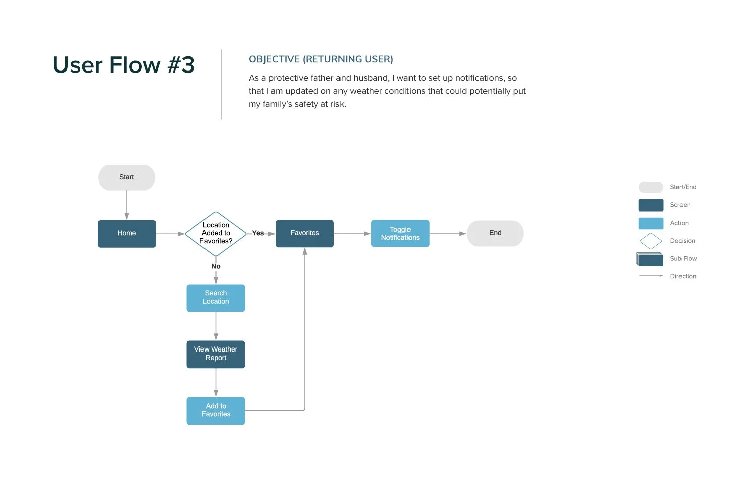 Before designing the screens for User Flow #3, I initially considered allowing users to add locations to their Favorites list and enable notifications for each using a toggle switch. Instead, I chose what I thought was a simpler solution: requiring users to enable notifications from their account settings, applying them to all locations in their Favorites. This approach lacked the customization users needed to decide for which locations to receive notifications.