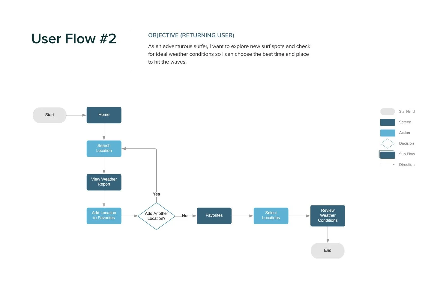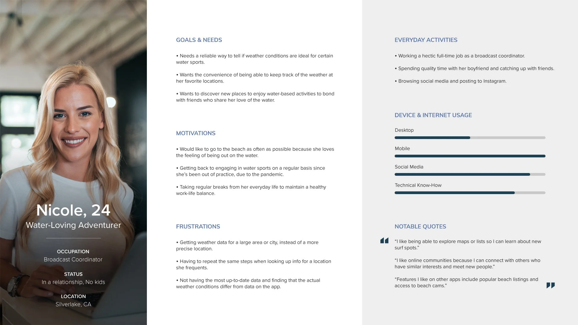 To better understand user behavior around water sport activities, I conducted interviews with five participants. This helped me to identify what is most important when preparing to go out on the water, determine which tasks users would like to complete, and document pain points with existing weather apps. The data provided great insight into creating the following user personas and flows.