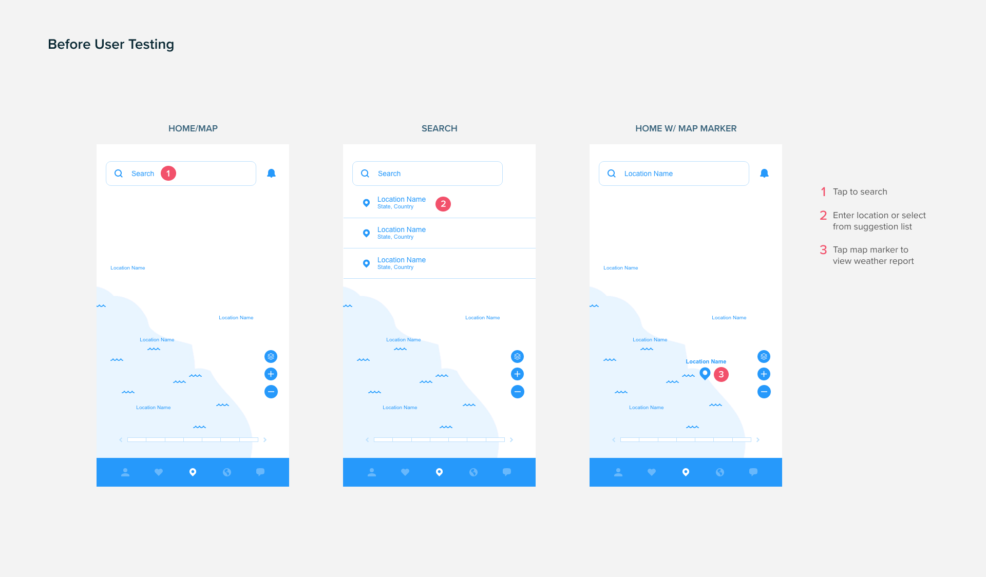 When testing User Flow #1, users could easily search for a location, but some were unsure how to view its weather report. Among those who noticed the map marker appear after searching, only three understood that they needed to tap the marker to access the report. Clearer indicators were necessary to guide users on what to do next.