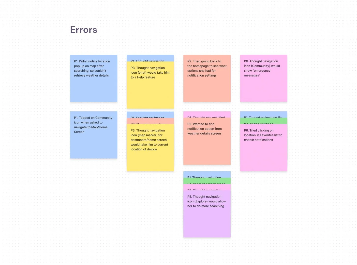 After conducting usability tests with six participants, I organized the data using an affinity map (below) and rainbow spreadsheet. This allowed me to come up with solutions to improve the next iteration of my prototype. My findings focused on two features: 1.) Viewing the Weather Report and 2.) Enabling Notifications
